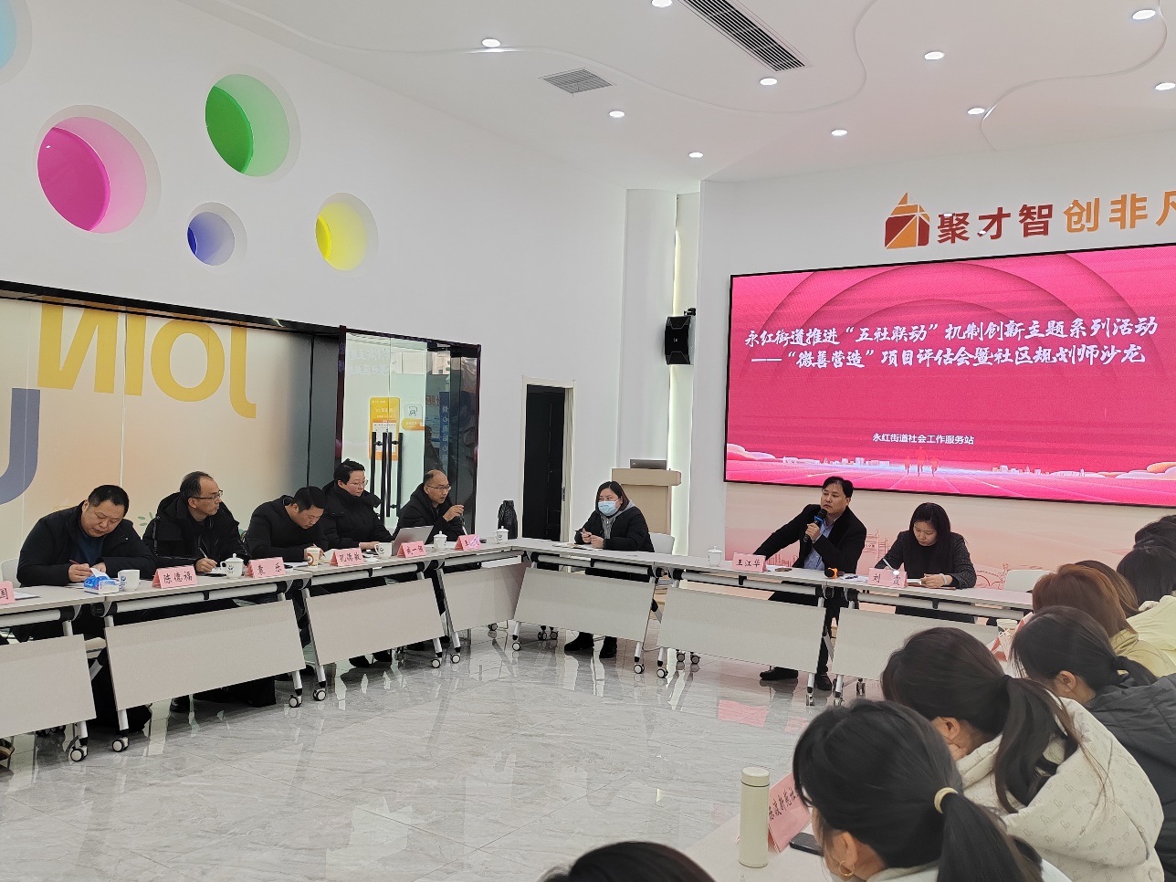 本次永红街道推进“五社联动”机制创新主题系列活动主要议程包括两个部分:一是开展永红街道“微善营造”项目评估会,永红街道下辖的十个社区分别就2024年有关“微善营造”项目中的策略分析、概念方案、实施计划及资金匡算各自做了精彩汇报。随后,与会社区规划师们对各社区申报的年度微改造项目可实施性和汇报情况进行综合评估打分。二是召开永红街道社区规划师沙龙,市民政局、永红街道、各社区代表与社区规划师们充分交流沟通,力求为共建永红街道“五社联动”等工作建言献策,以期待后续深入推进各项微改造项目的落地实施。