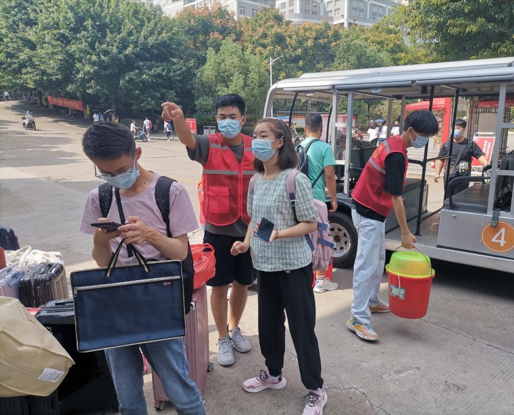 2021年9月14日,信息工程系迎新志愿者开始前往赣州市汽车南站及赣州市汽车总站迎接新生,并于风雨操场为新生办理报到手续。汽车站接待点,每一趟车一到站,新生和家长一下车,众多的迎新志愿者立即上前迎接礼貌问候,并帮助新生和家长提着沉重的行李。风雨操场中,各志愿者井然有序地带领新生办理入学手续,并不厌其烦地为新生、家长回答他们提出的各种问题。不少志愿者主动帮忙拎行李,帮助新生入住宿舍。新生细声地叫着学长学姐,老生们也热心地为他们介绍学校环境及学习生活中的各种注意事项。人头攒动,秩序井然。