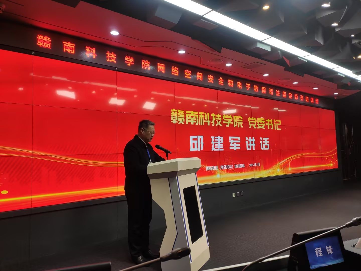 学校组织部部长蓝晓植致辞,对结业学员表示祝贺,对国投智能的支持与合作表示感谢。他指出,国投智能作为行业领军企业,与学校共同探索了诸多创新举措,此次培训班课程丰富多元,通过理论讲授与实践操作紧密结合的方式,让学员们深入掌握专业知识。蓝部长特别提到双方在电子数据司法鉴定领域的合作探索,致力于打造“政校企”合作的创新模式,推动赣州司法鉴定中心建设。他希望学员们将所学知识运用到实际工作中,为网络空间安全等领域贡献力量,并期待国投智能(美亚柏科)与学校继续深化合作。