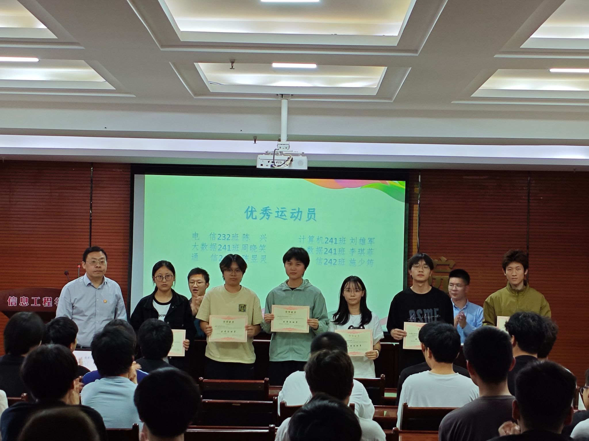 随后,进行了第一届活力信息体育文化节的颁奖仪式、球队队长聘书颁发仪式,运动员代表电信232班的陈兴同学上台发言。
