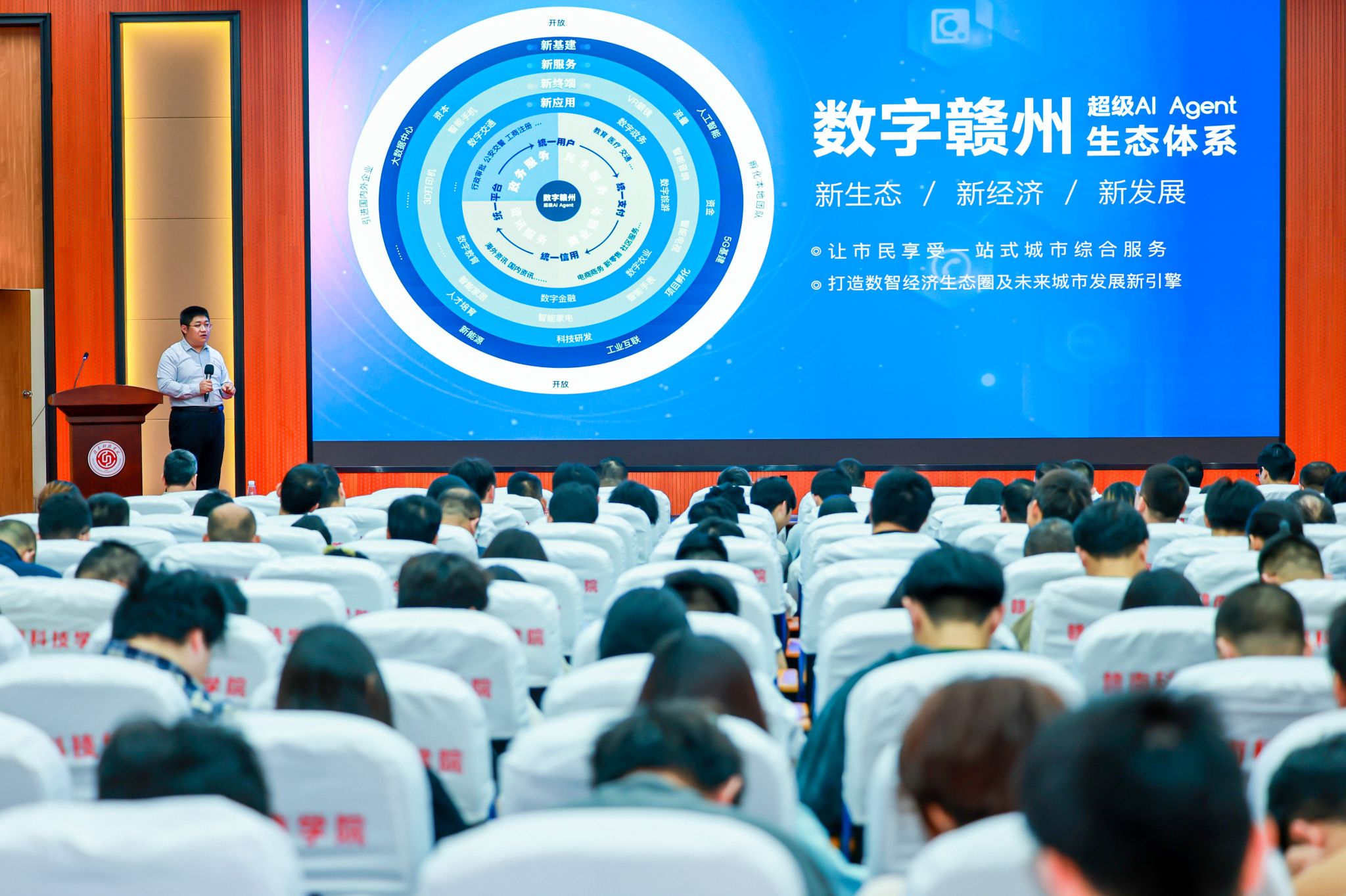 发布会上,我校2011届网络工程专业校友、江西云堤科技有限公司董事长甘首强深入介绍了“数字赣州”超级Ai agent的政策背景及未来趋势。