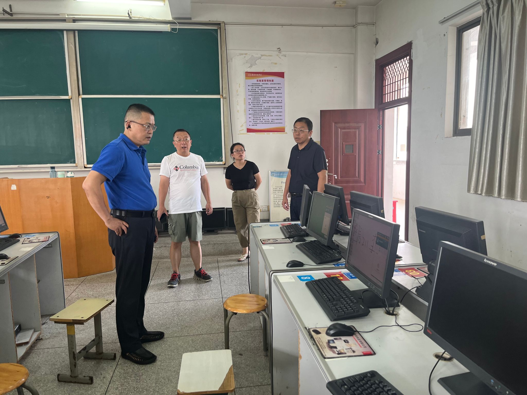 强化检查,护航安全。学院党委副书记邓小鸿、副院长胡健带队开展实验室安全大检查。在学院公共机房,学院检查小组细致查看了实验室环境、设备配置及运行状况,询问了实验室的日常管理、安全制度落实、应急预案准备及新学期教学计划安排等情况。也发现了地板脱落等问题,并提出了具体的整改意见和建议,要求实验室负责人要高度重视,立即行动,对发现的问题进行彻底整改,务必做到安全第一、预防为主。