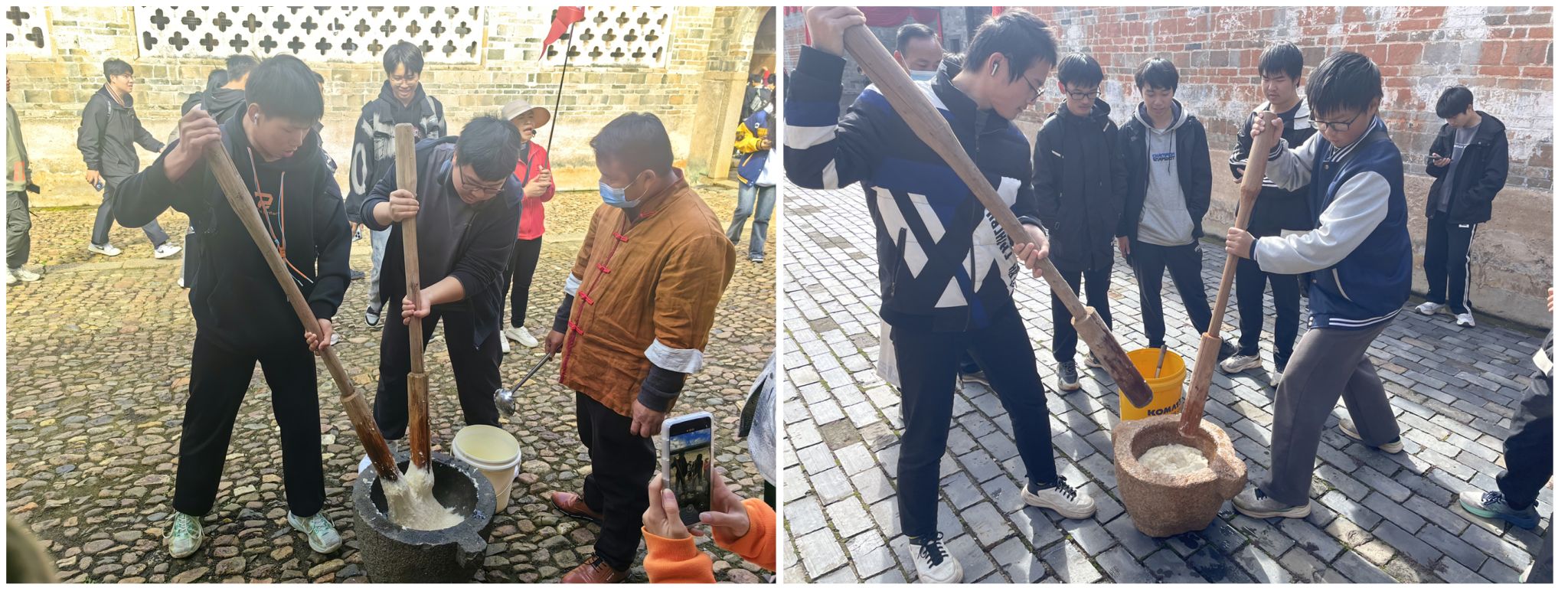 在关西围景区,师生参观客家博物馆、客家恳亲馆,在“世客厅”、“世客情”、“世客魂”等主要篇章生动感受客家人民积极劳作的场景,认真学习客家非遗织带的制作工序,观摩客家非遗竹编的制作手艺,深刻感受到客家文化的魅力。随后,师生们体验了客家糍粑的制作过程,通过动手实践,学生们齐心协力制作出了美味的客家糍粑。在世界客家民俗文化城,学生们沉浸式体验了来自世界各地的非遗项目,领略从围屋走出去的客家先人敢闯爱拼的精神,以及在各行各业创造辉煌业绩的风采。