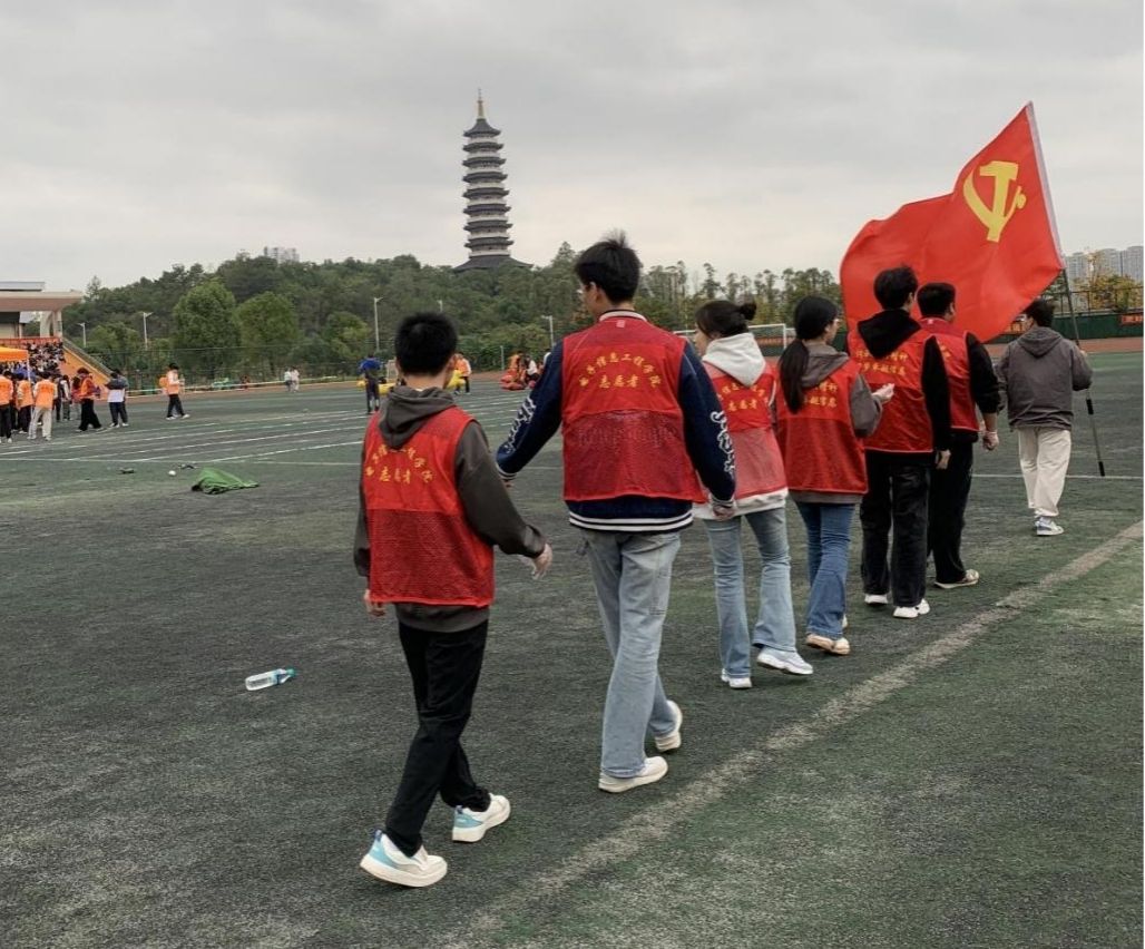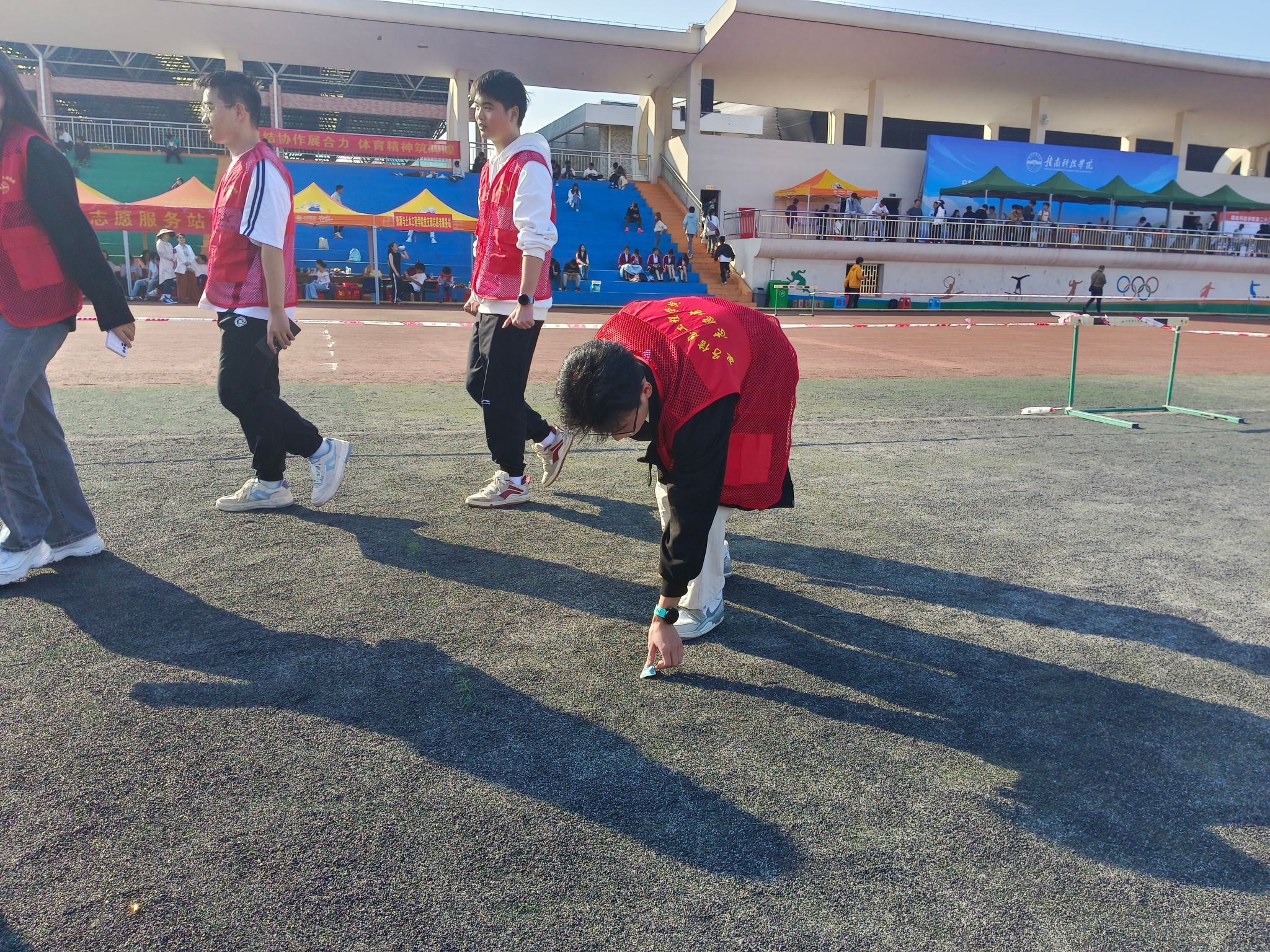 金秋的阳光虽然炙热,但是志愿者们没有丝毫的抱怨和退缩,他们身着统一的红色马甲,胸前党徽熠熠生辉。活动现场,支部志愿者以小组为单位,轮流在田径场上巡逻。他们细心地巡查运动场每一个角落,无论是废弃的纸屑还是丢弃的矿泉水瓶,都一一捡起并清理干净。他们的辛勤付出让运动会场保持了整洁和美观,为师生创造一个更加健康、舒适的比赛环境。